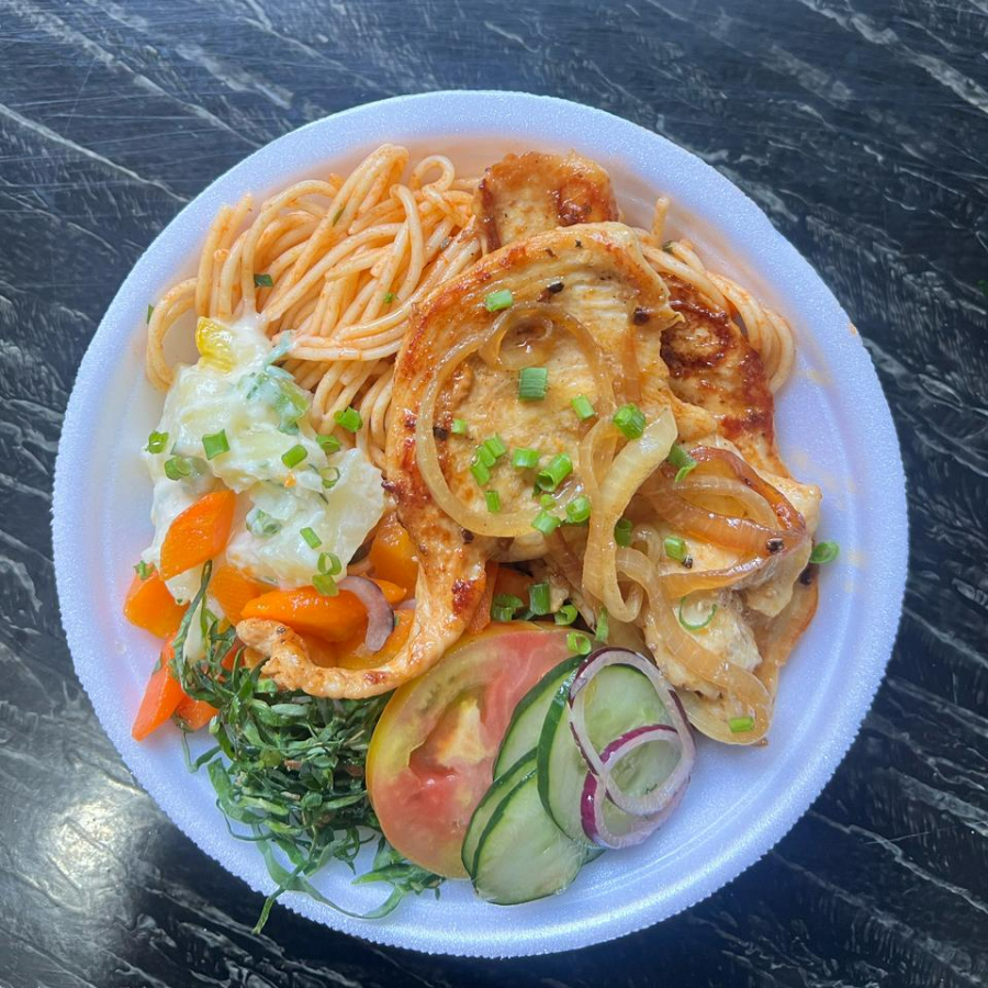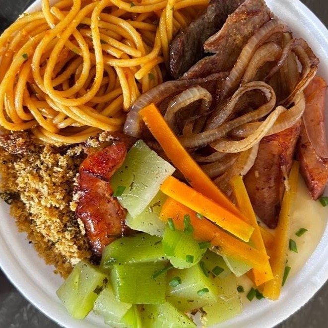 Marmita de file de frango acebolado, acompanhado de arroz, feijão de caldo , macarrão e verduras variadas