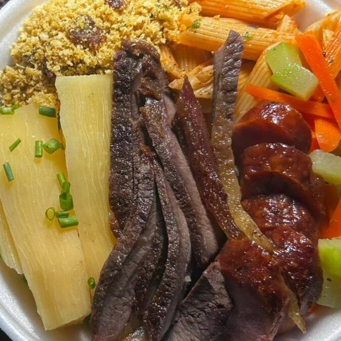 Nossa deliciosa marmitex de churrasco acompanha, arroz feijão de caldo, mandioca e vinagrete