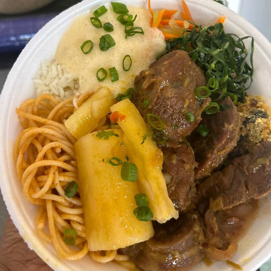 Marmita de carne de panela com mandioca cozida, arroz feijão de caldo, macarrão e verduras variadas