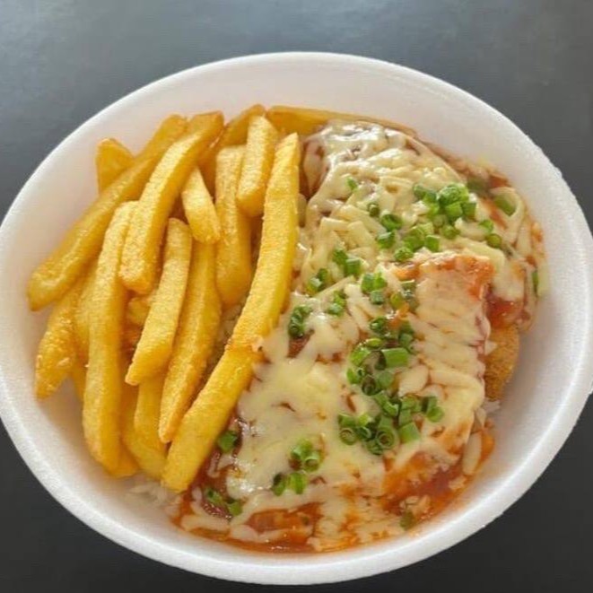 Acompanha: Arroz Branco, Batata frita, Filé de frango com molho caseiro, evas finas e musarela.