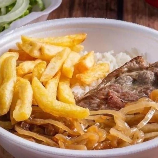 Marmitex de bife acebolado + batata frita, acompanha arroz feijão de caldo e batata frita