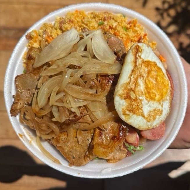 Nossa Deliciosa Marmitex : acompanha arroz, feijão de caldo ou tropeiro e farofa de banana da terra