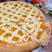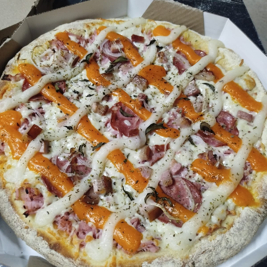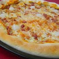 Massa, molho de tomate, mussarela, frango, bacon, orégano e cebola.