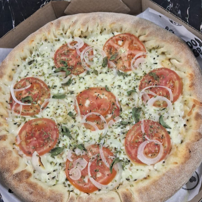Massa, molho de tomate, mussarela, frango, catupiry, orégano e cebola.