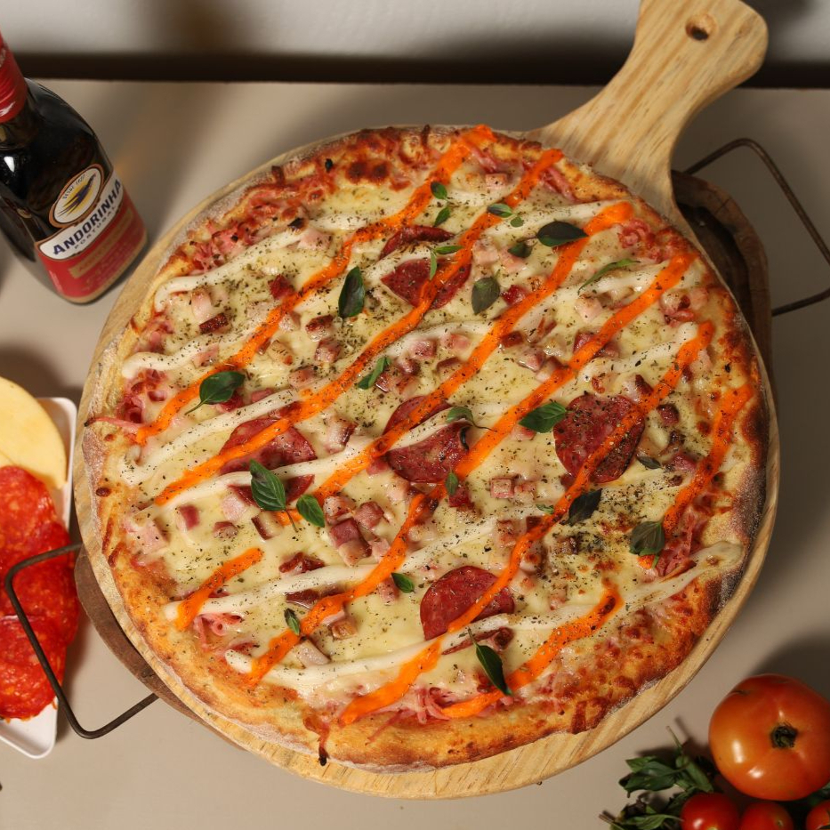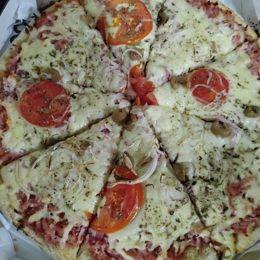 Massa, molho de tomate, presunto, mussarela, calabresa, azeitona catupiry, cheddar, cebola e orégano.