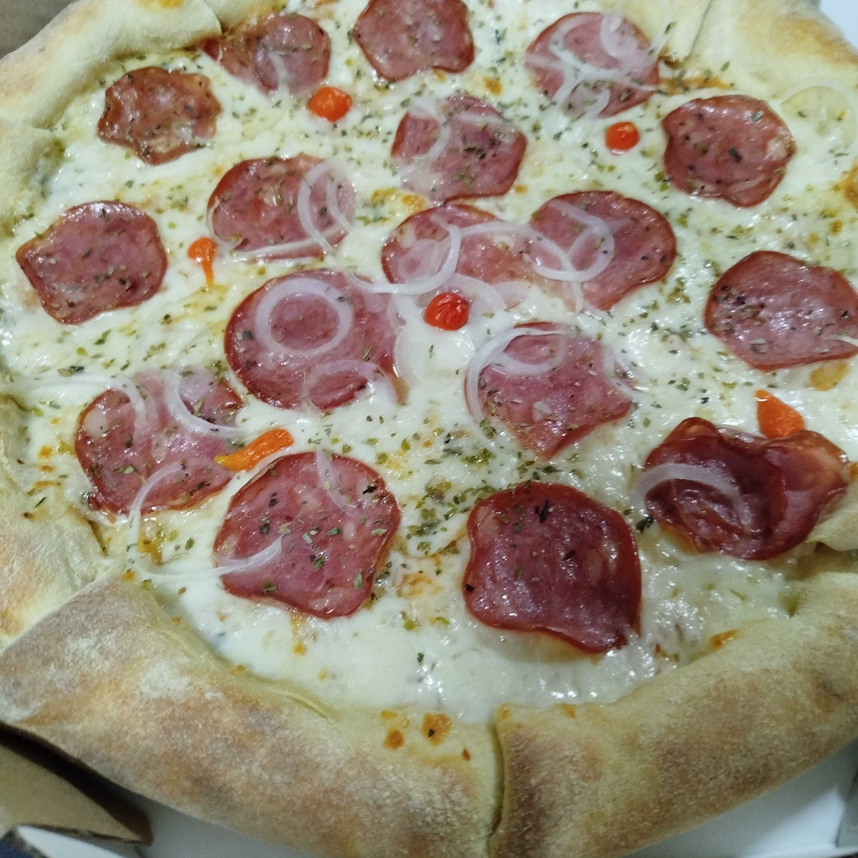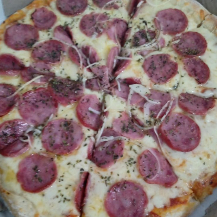 Massa, molho de tomate, mussarela, calabresa, cebola e orégano.