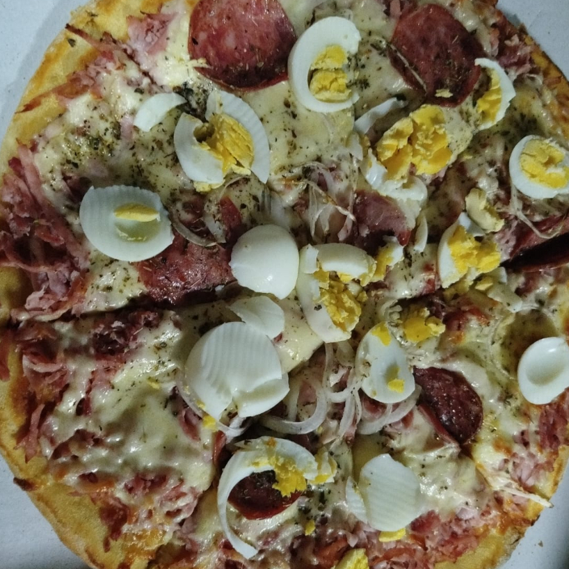 Massa, molho de tomate, presunto, mussarela, ovo, azeitona, calabresa, orégano e cebola.