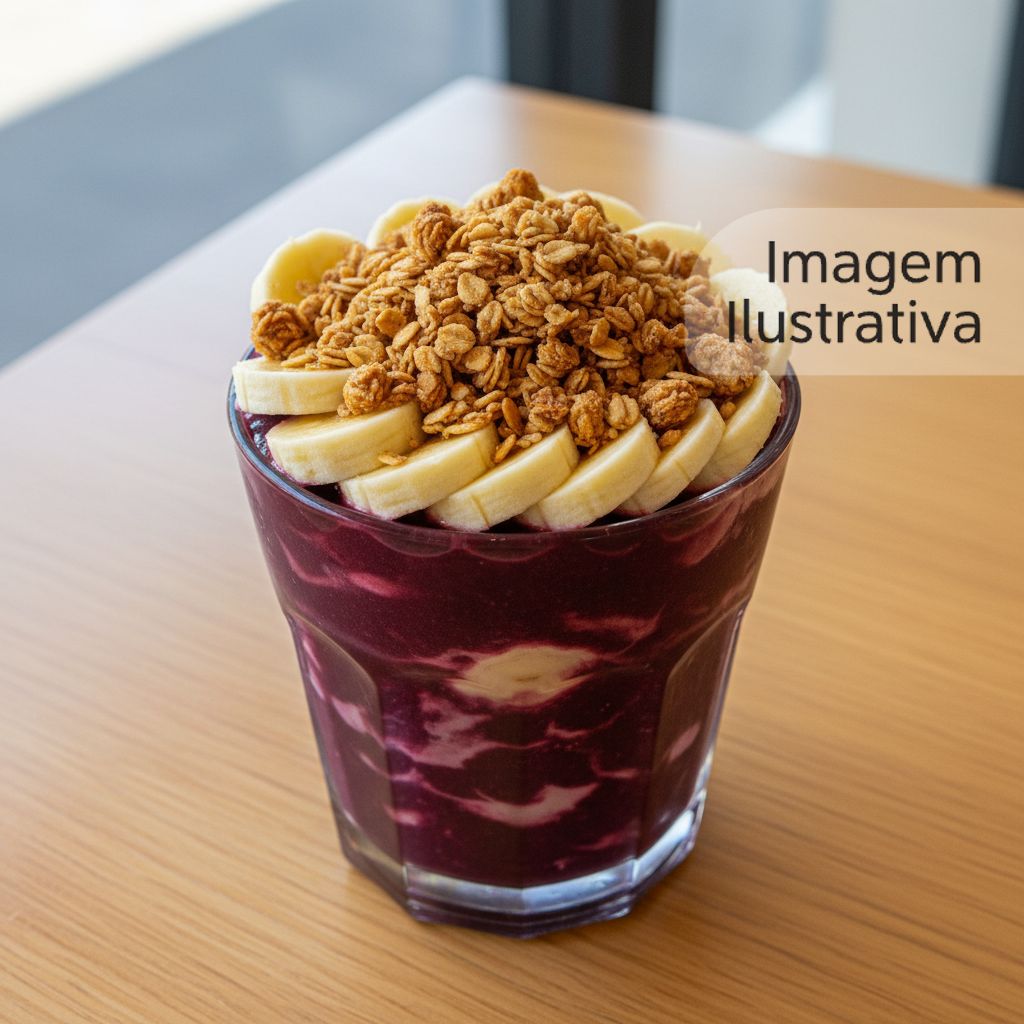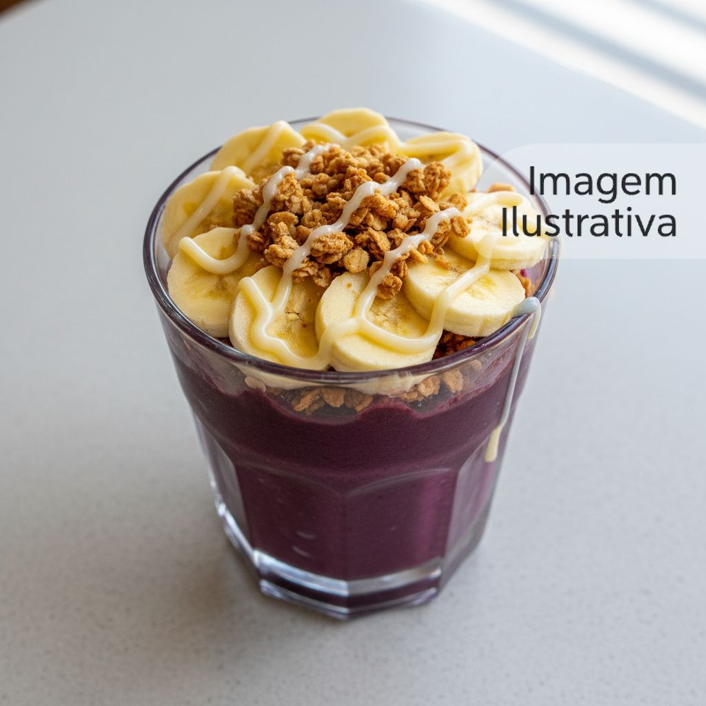 Açaí com xarope de guaraná, leite condensado, banana e granola. Uma explosão de sabores e texturas!