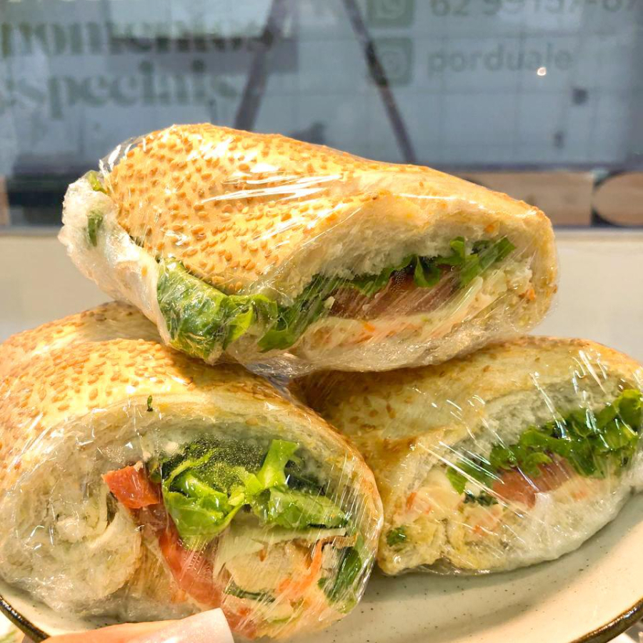 Delicioso sanduíche com patê de frango, mussarela e salada.