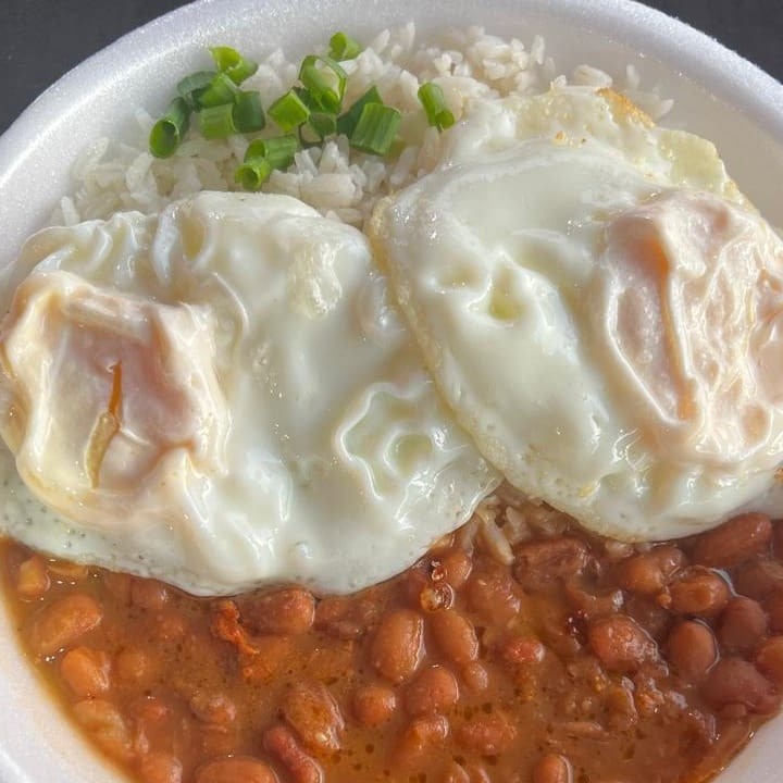 Dois ovos fritos na chapa acompanha: arroz branco e feijão de caldo.
