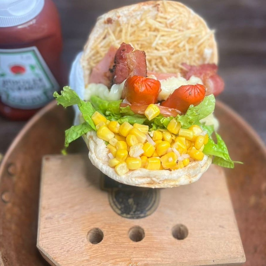 Hambúrguer, 1salsicha, bacon, mussarela, presunto, Catupiry, alface americana e tomate abacaxi, milho e batata