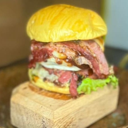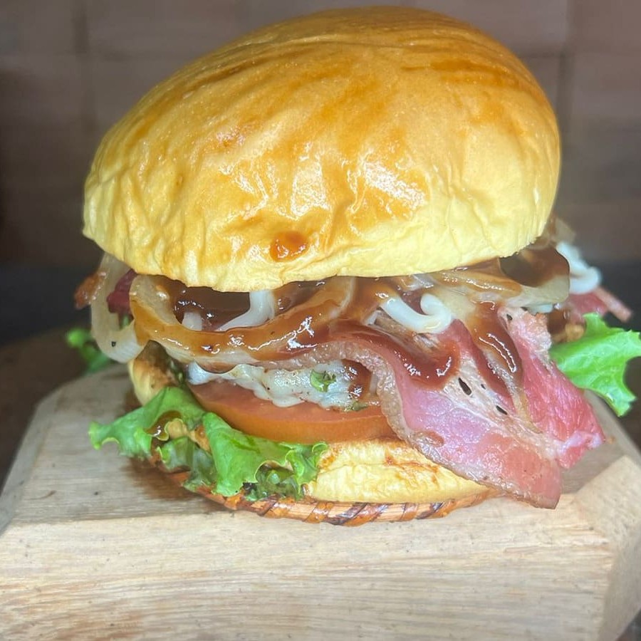 Acompanha 2 unidades de hamburguer, muçarela, bacon, alface americana, tomate, requeijão cremoso e molho da casa