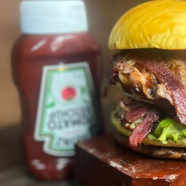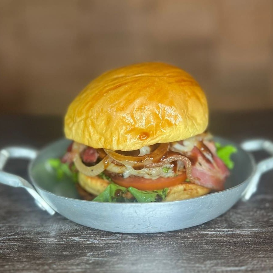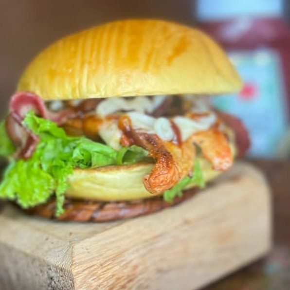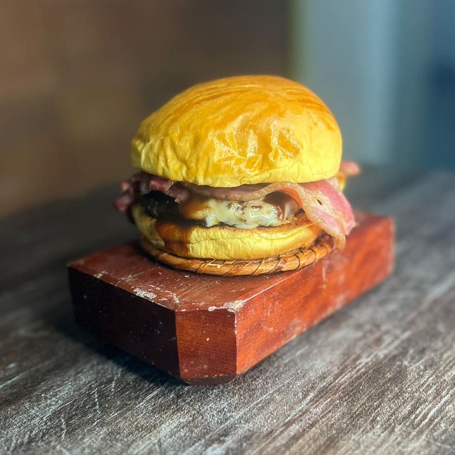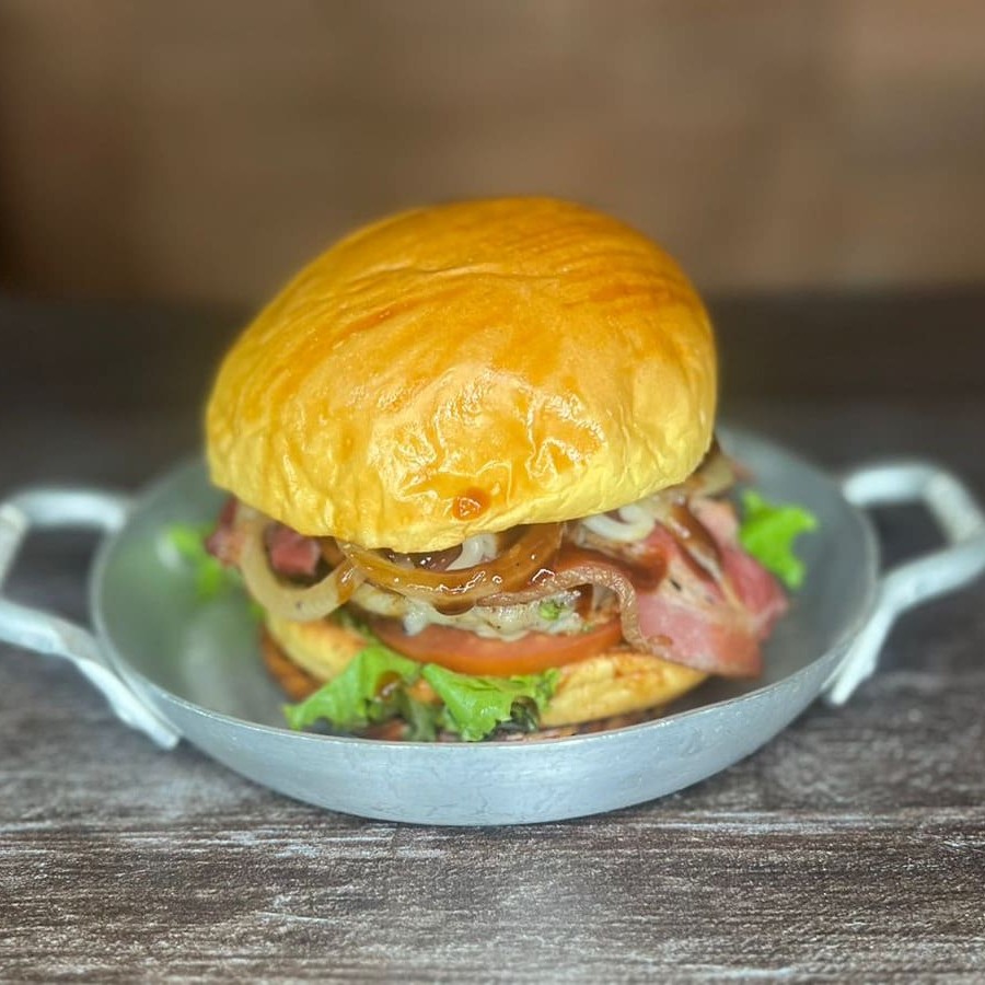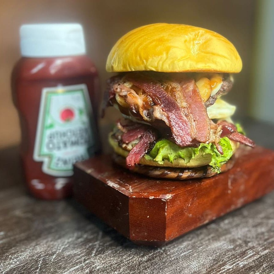 Pão brioche, hambúrguer, muçarela, bacon e delicioso molho da casa