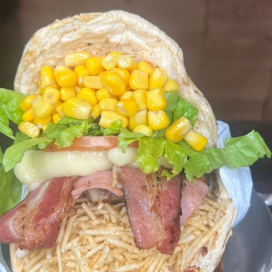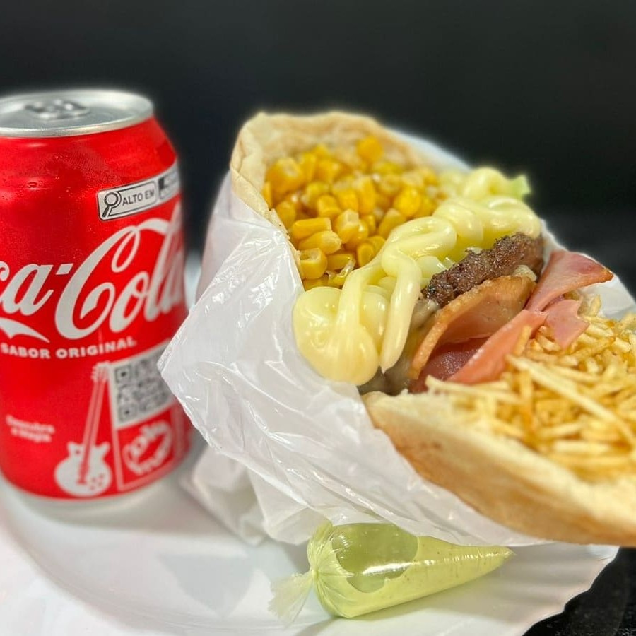 Pão, carne a escolha, muçarela, bacon, Catupiry, alface, tomate, milho verde e batata palha.