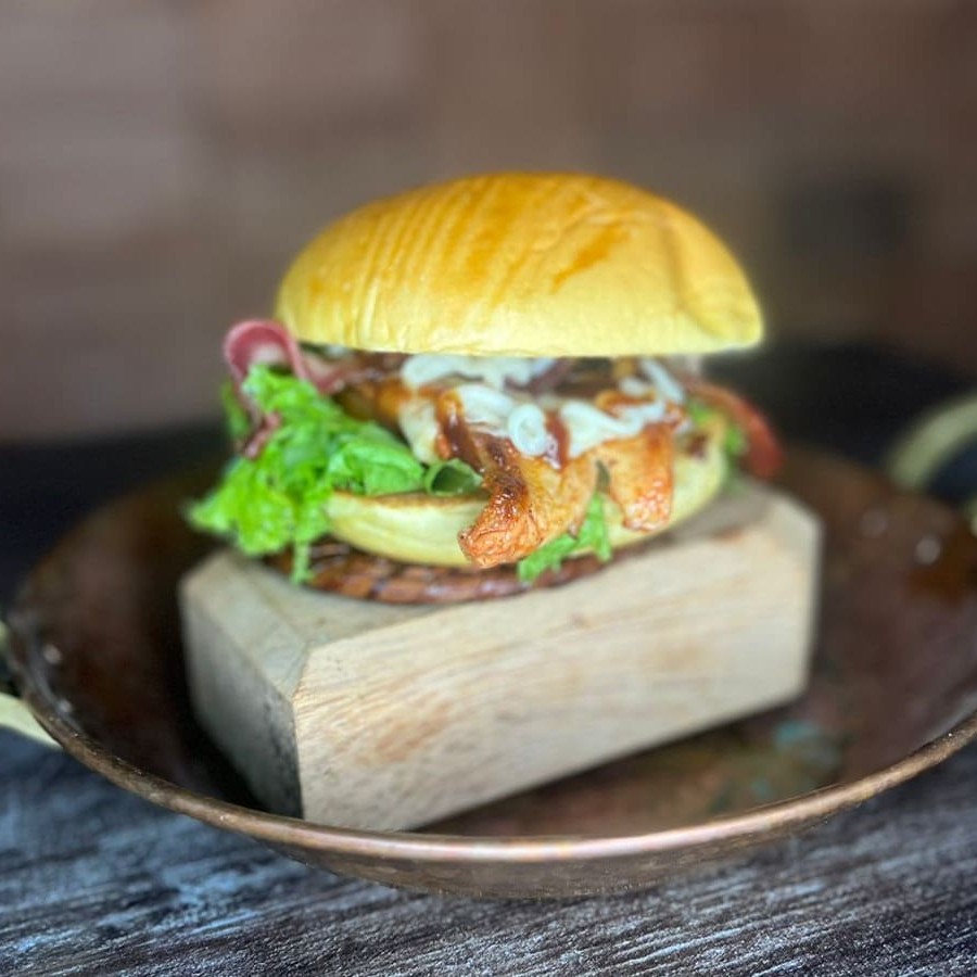 Pão de brioche, hambúrguer, muçarela e molho da casa.