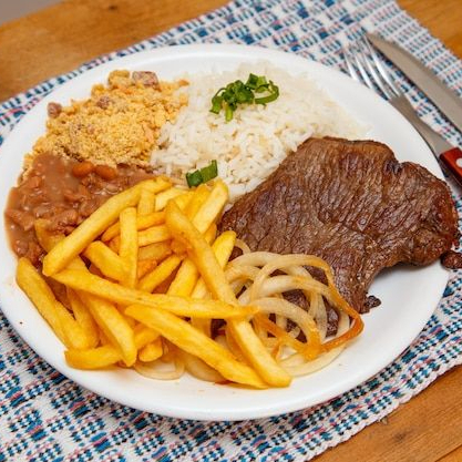 Acompanha: arroz branco, feijão de caldo e suculentos filés de frango acebolados.