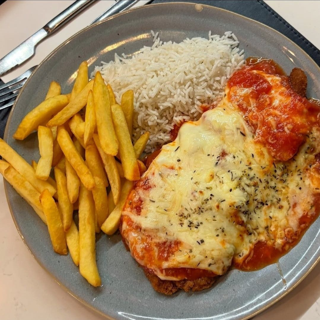 Parmegiana de Frango(Acompanha, Arroz, batata frita e salada).