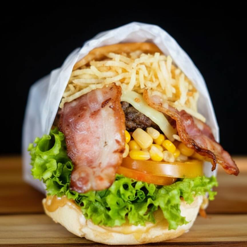 Pão, carne a escolha, muçarela, bacon, requeijão cremoso, alface americana, tomate, milho verde e batata palha.