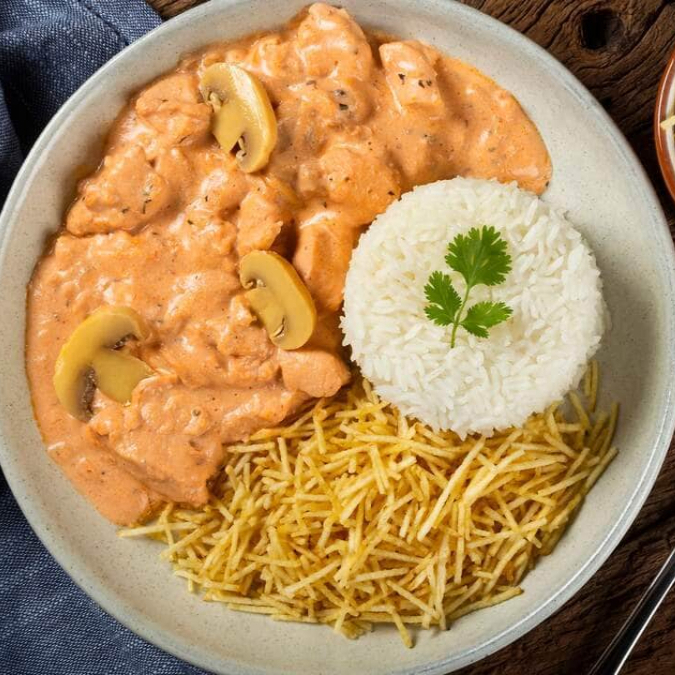 Acompanha arroz branco, batata palha e estrogonofe de frango. Serve uma pessoa
