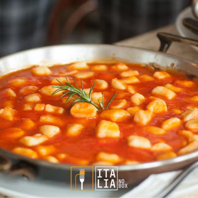 Nhoque artesanal de batata, macio e leve, servido com nosso clássico molho sugo, preparado com tomates frescos e ervas finas.