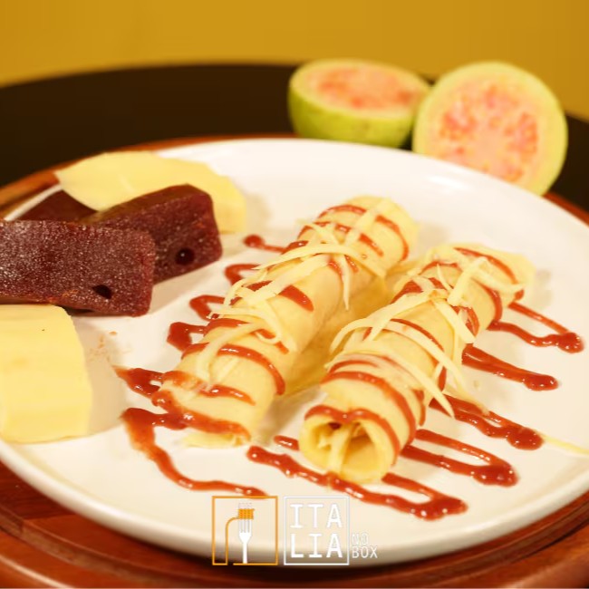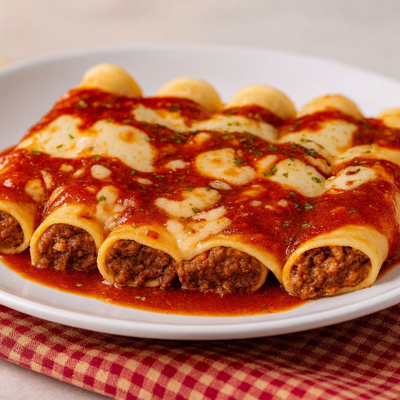 5 unidades de panquecas com delicioso recheio de carne moída, coberta com molho vermelho e queijo muçarela derretido.