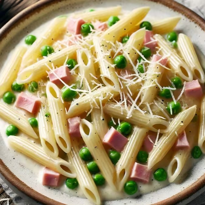 Massa fresquinha envolvido em molho branco com presunto, queijo muçarela e ervilhas frescas.