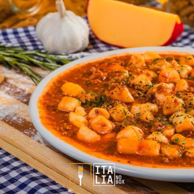 Nhoque de batata caseiro preparado artesanalmente e servido com nosso tradicional molho à bolonhesa, preparado com carne moída refogada com tomates frescos e ervas finas.