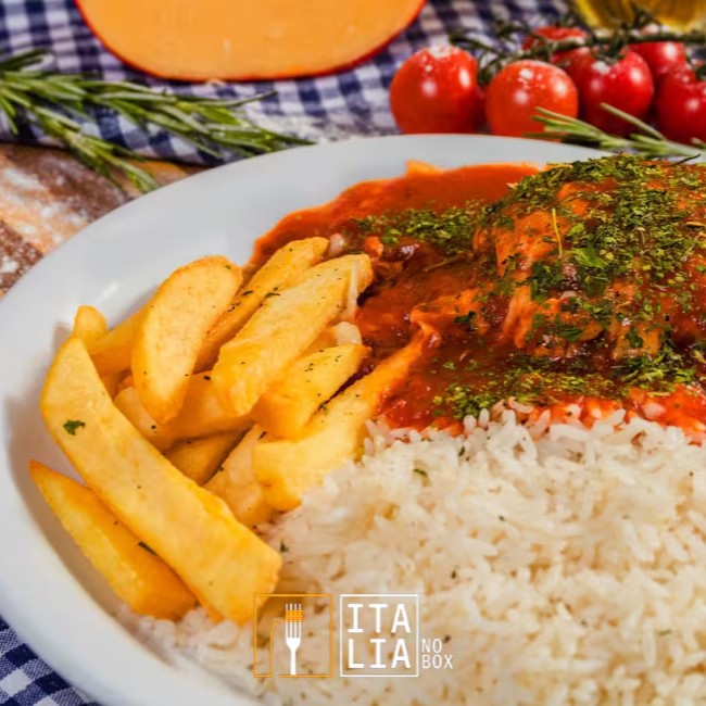 Almôndegas empanadas, cobertas com molho vermelho caseiro e queijo muçarela derretido. Acompanha arroz branco soltinho e batata frita crocante