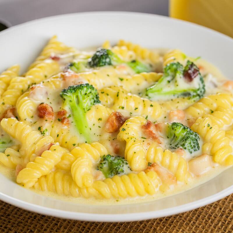 Massa fresquinha envolvido em molho branco cremoso com brócolis cozidos e cubos de bacon.