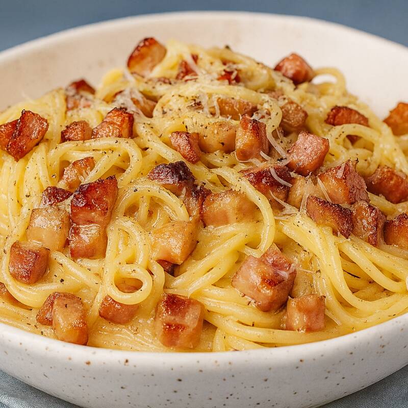 Massa fresquinha envolvido em molho de queijo parmesão com ovos, finalizado com cubos de bacon e pimenta do reino.