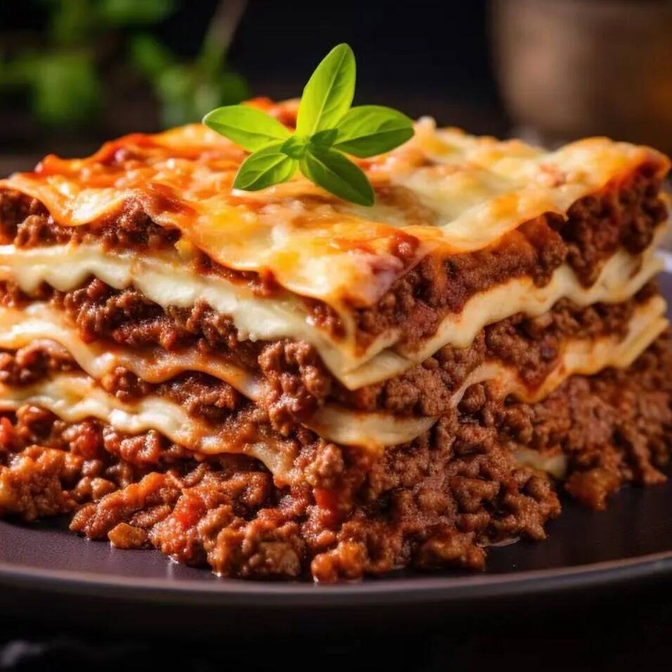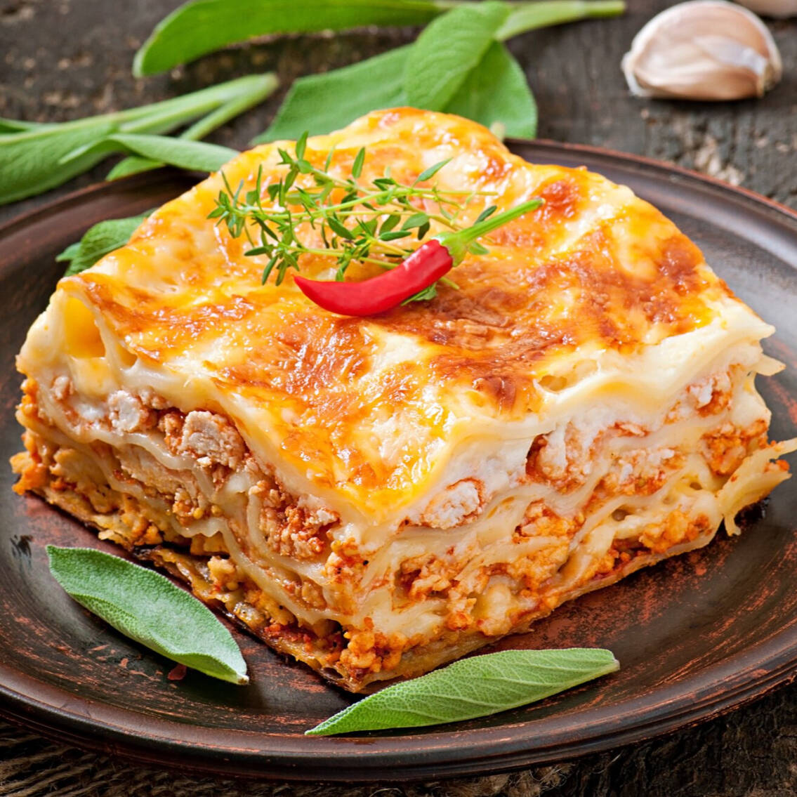 Camadas generosas de massa intercaladas com muçarela derretida, presunto saboroso e carne moída ao molho vermelho e finalizadas com gratinado dourado