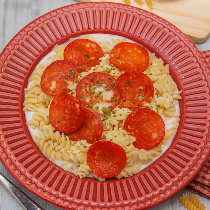 Massa fresquinha envolvido em molho branco com requeijão cremoso, queijo muçarela, parmesão e pepperoni, finalizado com maçarico.