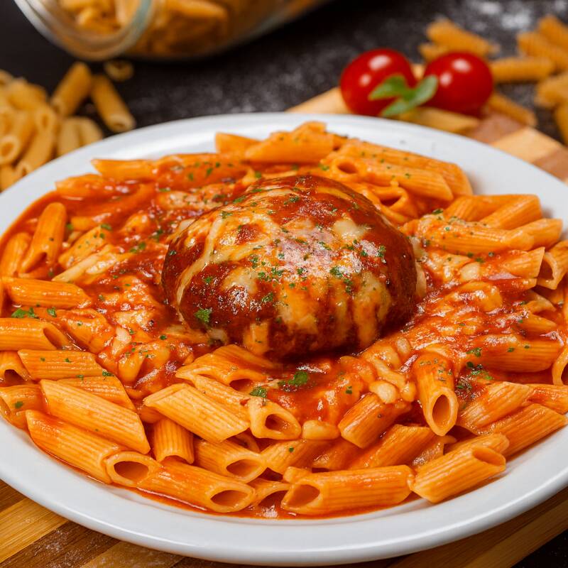 Massa fresquinha envolvido em molho vermelho com polpetone, finalizado com queijo muçarela.