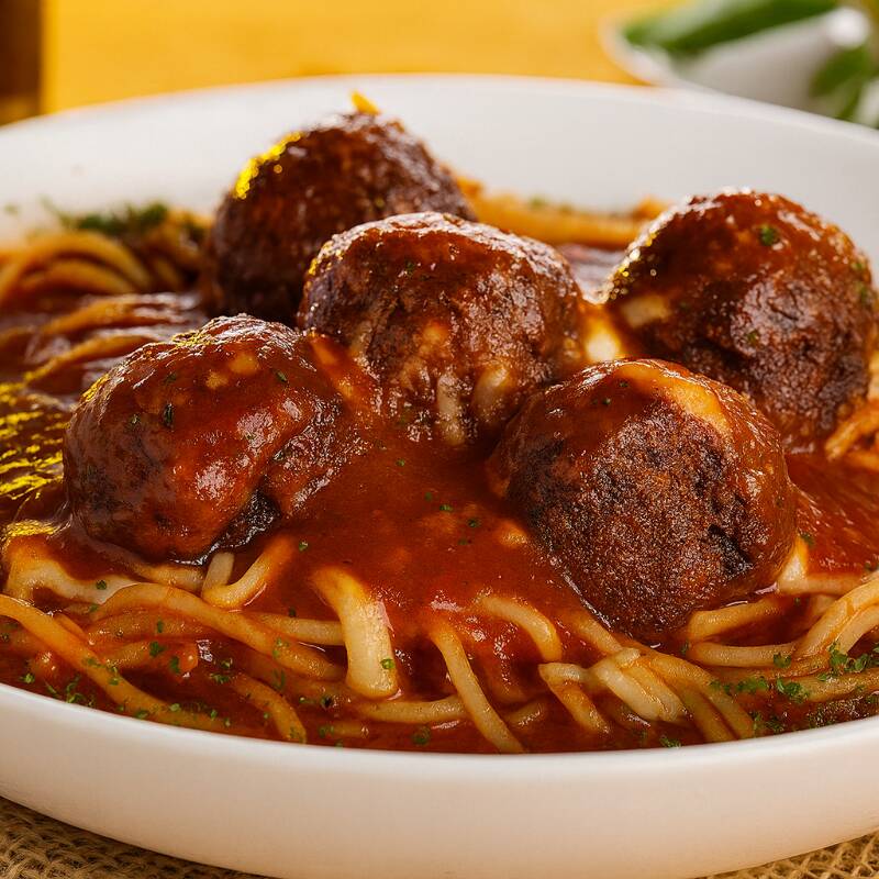 Massa fresquinha envolvido em molho vermelho com deliciosas almôndegas, finalizado com queijo muçarela.