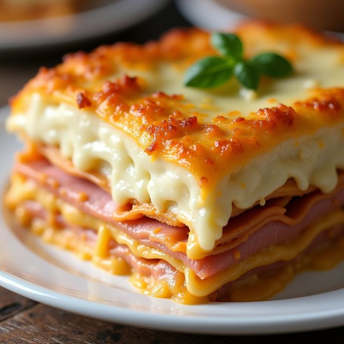 Lasanha recheada com presunto, camadas de queijo muçarela derretido e molho vermelho caseiro.