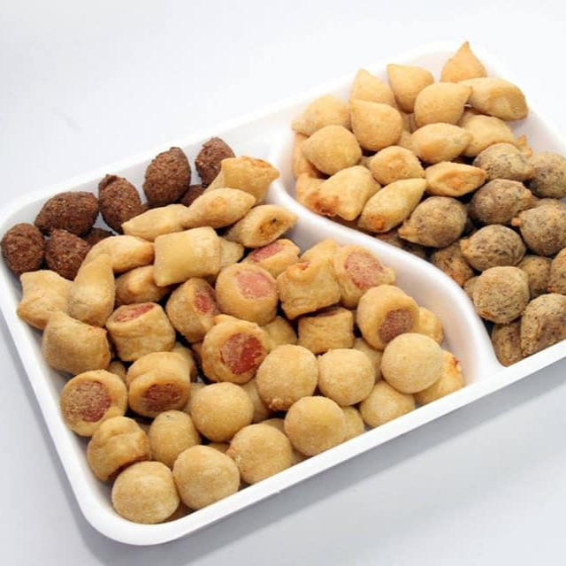50 Salgados Sortidos Só Fritos (7 tipos) : coxinha de frango, kibe tradicional o sem recheio, croquete de carne, croquete de frango, bolinha de queijo e presunto, pneuzinho de salsicha, risole de milho.