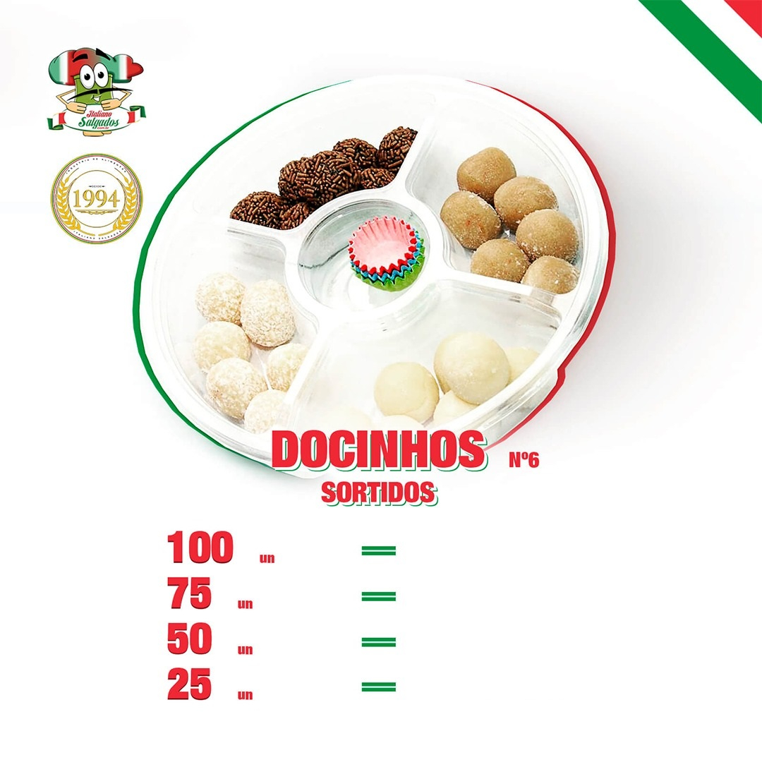 100 unid. Docinhos Sortidos : Forminha Nª6 - Tamanho Coquetel (4 tipos) - Não escolhe - Sabores: Brigadeiro, Beijinho, Leite Ninho e Cajuzinho. Produção própria artesanal.
