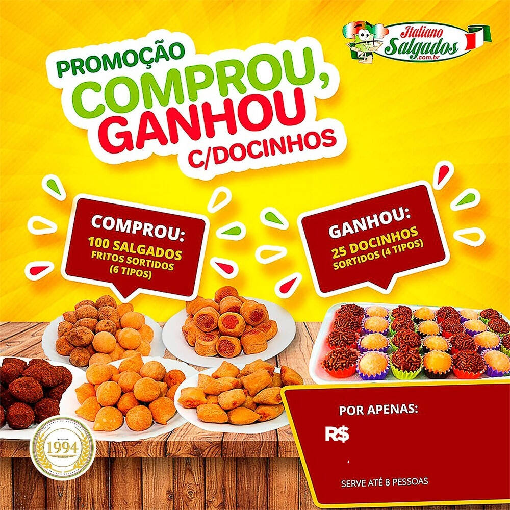 Comprou Ganhou - 100 Unid. Salgados Fritos + 25 Unid. Docinhos Sortidos (4 tipos) Brigadeiro, Beijinho, Leite Nin : Variedades (não tem a opção de escolher a quantidade e variedade de cada que vai): Salgados Sortidos 7 Tipos: Coxinha, Kibe Tradicional, Risole de Milho, Bolinha de Queijo e Presunto, Croquete Carne c/ Requeijão Cremoso, Croquete de Frango c/ Requeijão Cremoso, Pneuzinho de Salsicha.