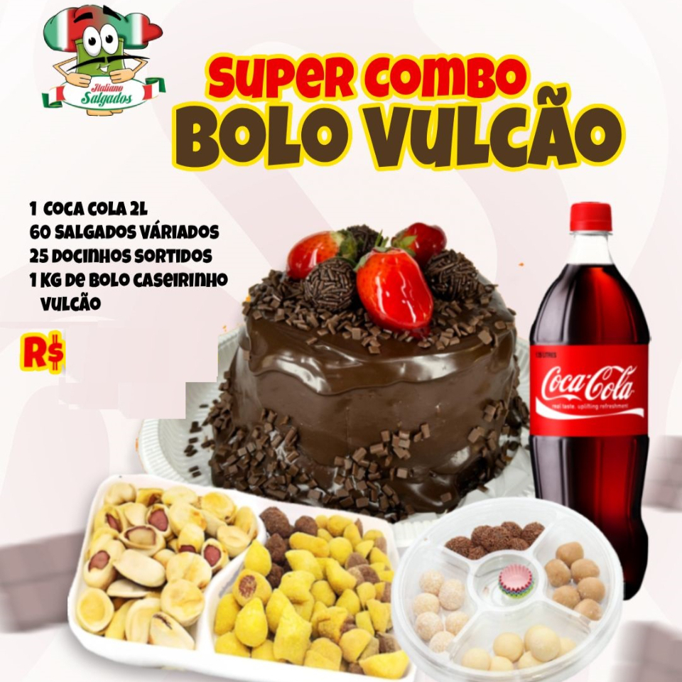 Super Combo Bolo Caseirinho Vulcao: Bolo Caseiro Vulcao Ate 1kg + 60 Unid. Salgados Variados Fritos e Assados (10 tipos), 25 Unid. Docinhos Sortidos (4 tipos) + 1 Unid. Coca - Cola 2 Lts. Não tem a opção de escolher as quantidades e itens. *Lembrando que não e torta de aniversario e sim bolo caseirinho com cobertura +++.