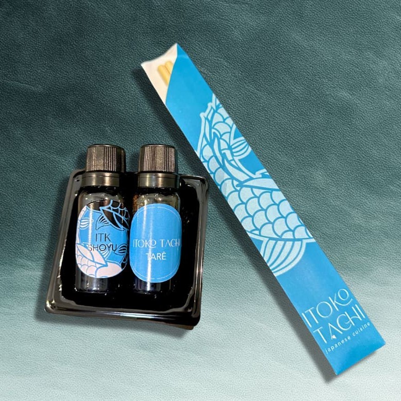 Kit para 1 pessoa: contem um par de hashi, 1 Shoyu Itoko, 1 Tarê da Casa e 2 bercinhos de plástico.