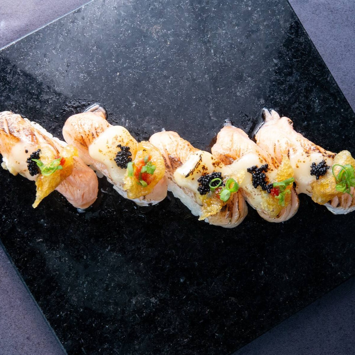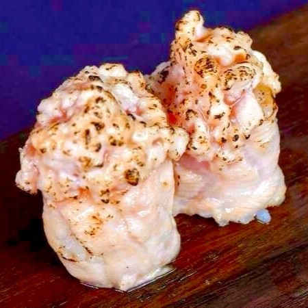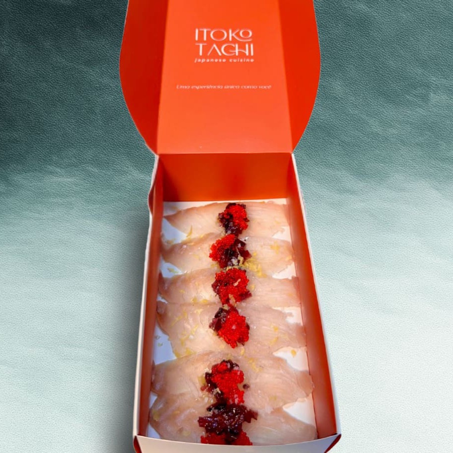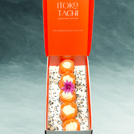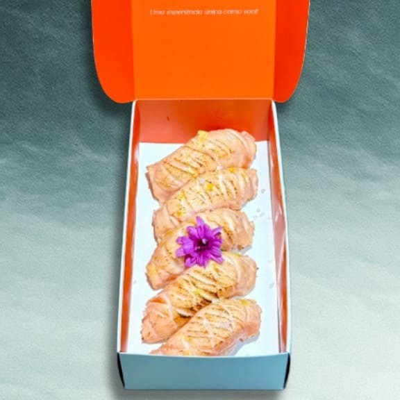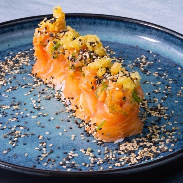 Lâminas frescas de salmão delicadamente maçaricadas sobre bolinhos de arroz temperado no ponto certo. Finalizado com um toque suave de molho especial e cebolinha fresca. Uma experiência única de sabor, textura e aroma, perfeita para quem aprecia o melhor da culinária japonesa no conforto de casa.