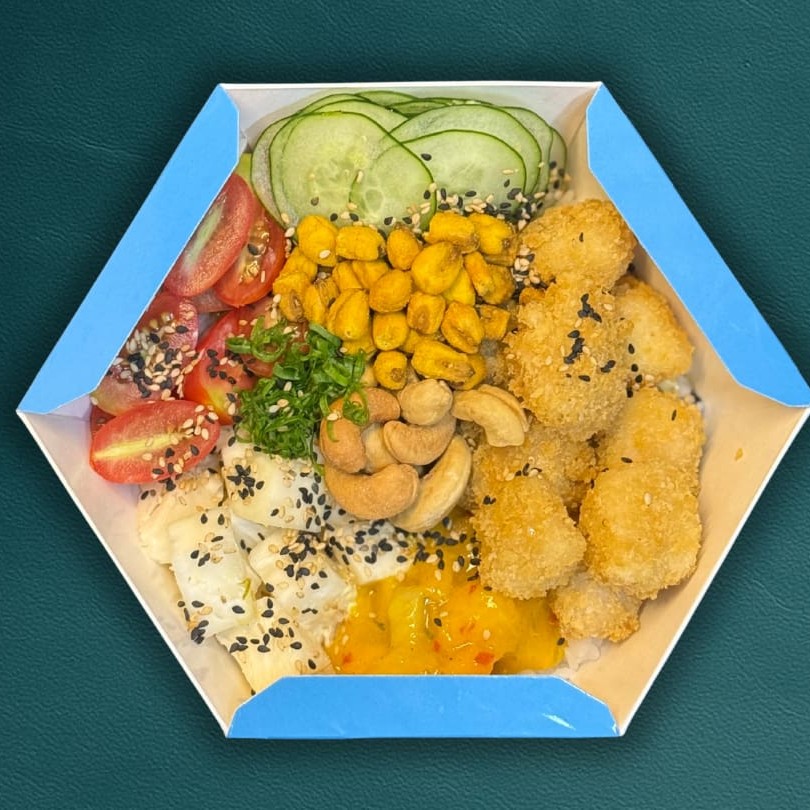 Leve, fresco e irresistível: shari com manga, abacaxi, pepino, tomate cereja e cubos de tilápia crocante. Finalizado com milho crocante mostarda & mel e castanha de caju.