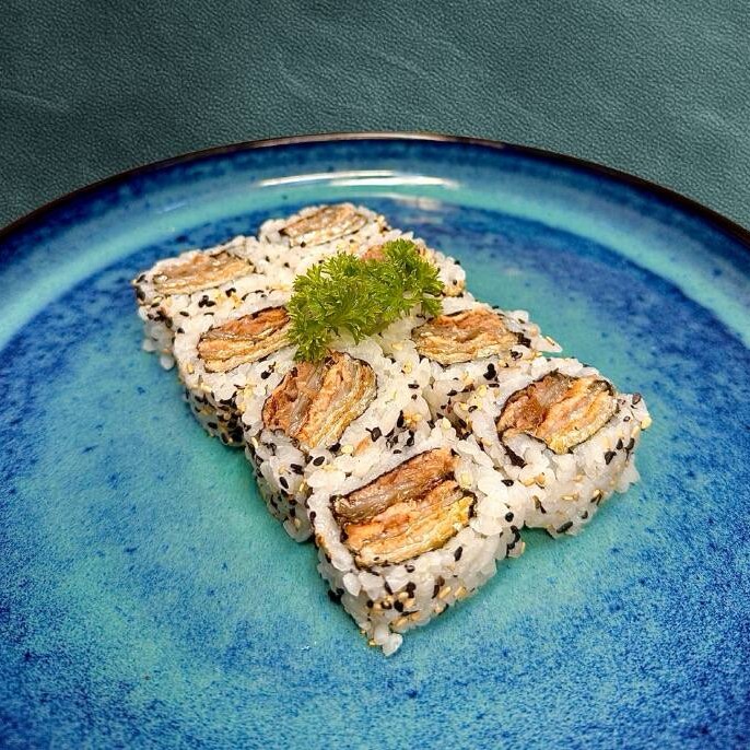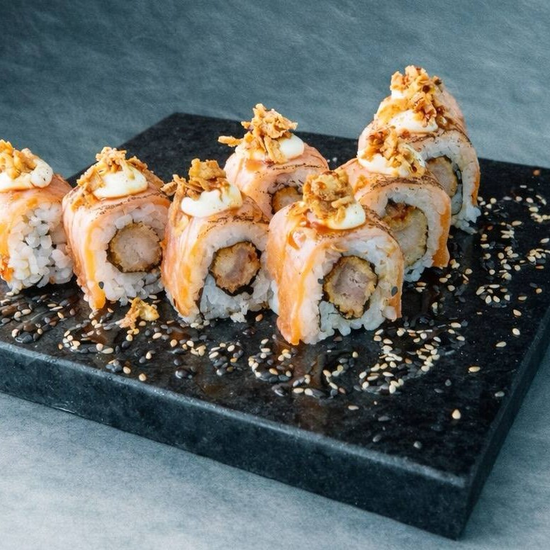 Shari temperado, tilápia fina com creamy cheese, envolto em alga e finalizado com capa de salmão e cebola crispy.