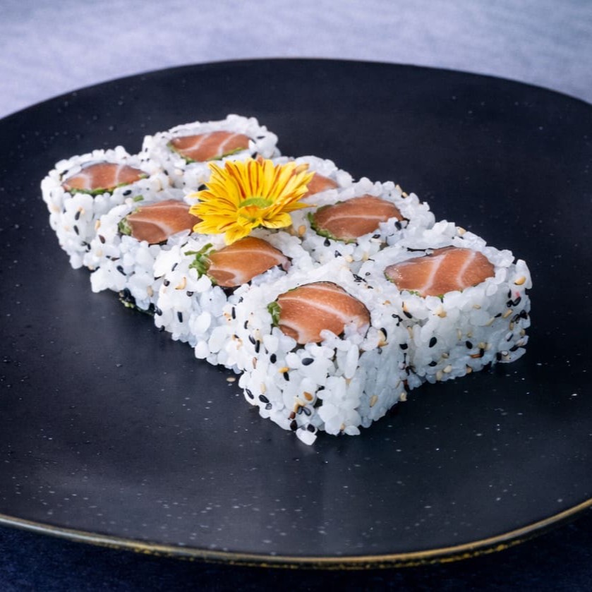 Desfrute do uramaki de salmão, onde alga nori e arroz japonês se encontram com salmão e gergelim, oferecendo uma experiência de sabor sofisticada.