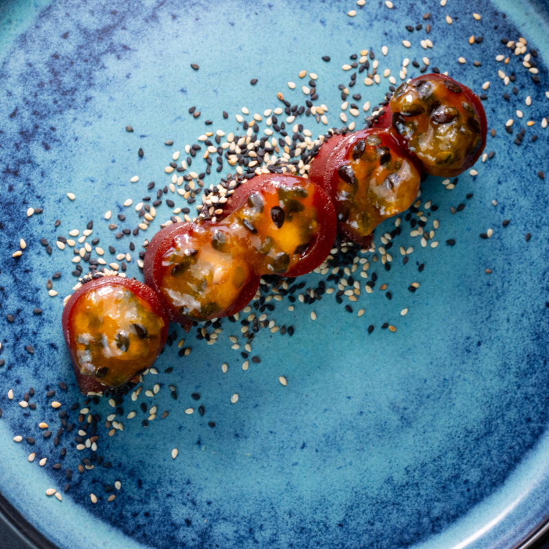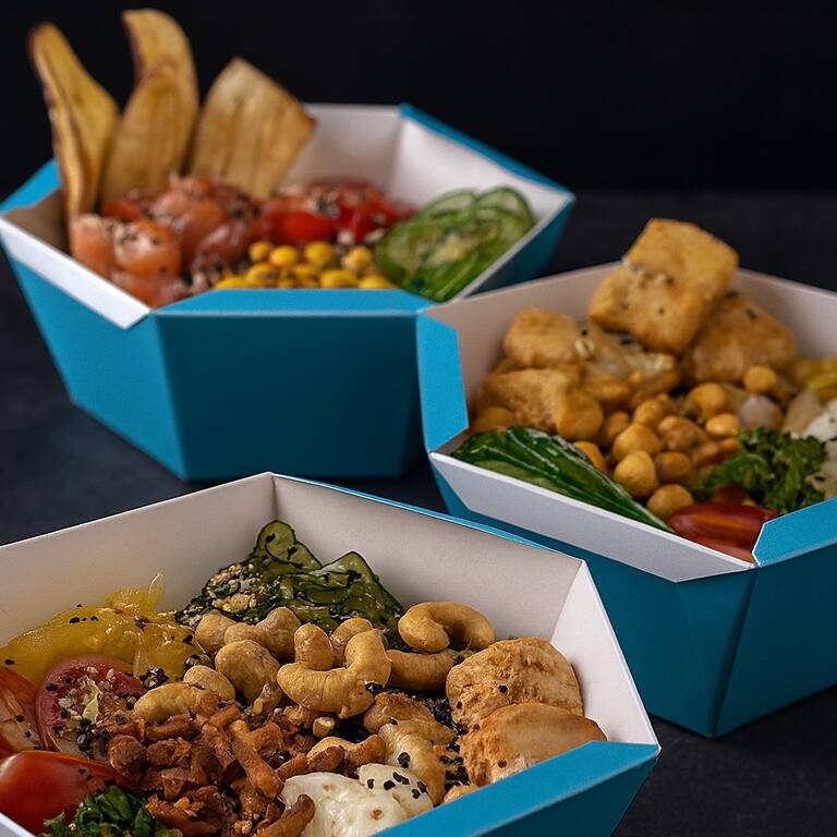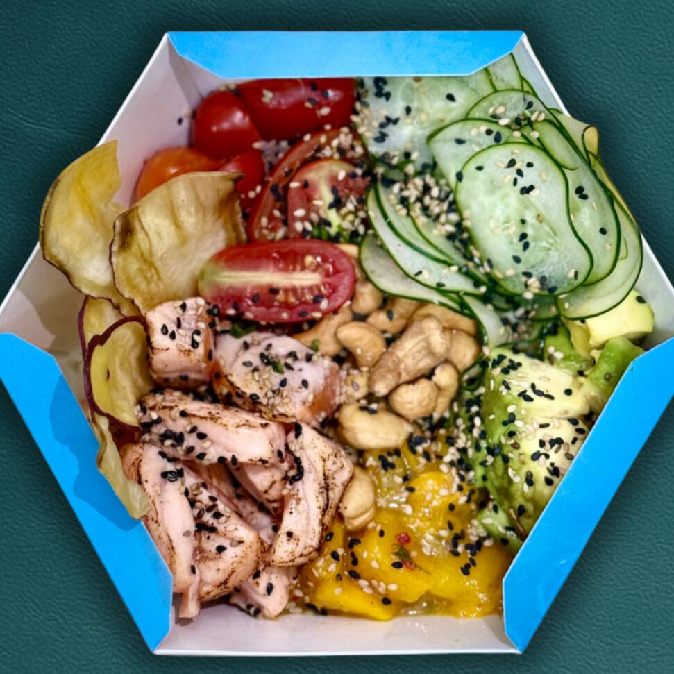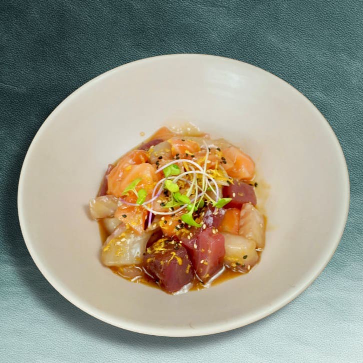 Um poke autoral cheio de frescor e personalidade. A base de shari recebe manga, pepino, tomate cereja e abacate. O destaque fica por conta dos cubos de salmão maçaricados com flor de sal, combinados à crocância dos chips de batata doce e castanha de caju. Finalizado com gergelim e azeite de oliva, é uma explosão equilibrada de sabor e textura.