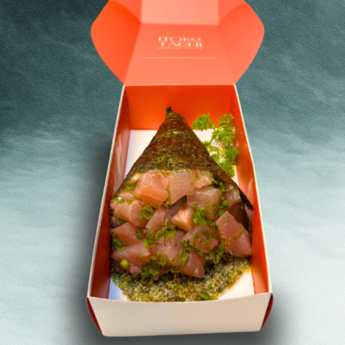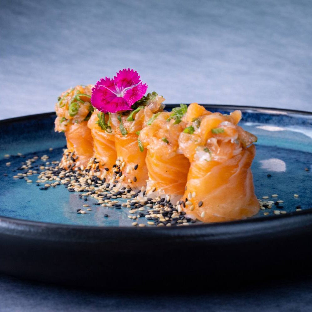 Lâmina de salmão enrolada com arroz japonês, recheada com tartare de salmão crítico levemente apimentado, finalizado com cebolinha e raspas de limão, oferecendo um sabor picante e refrescante.