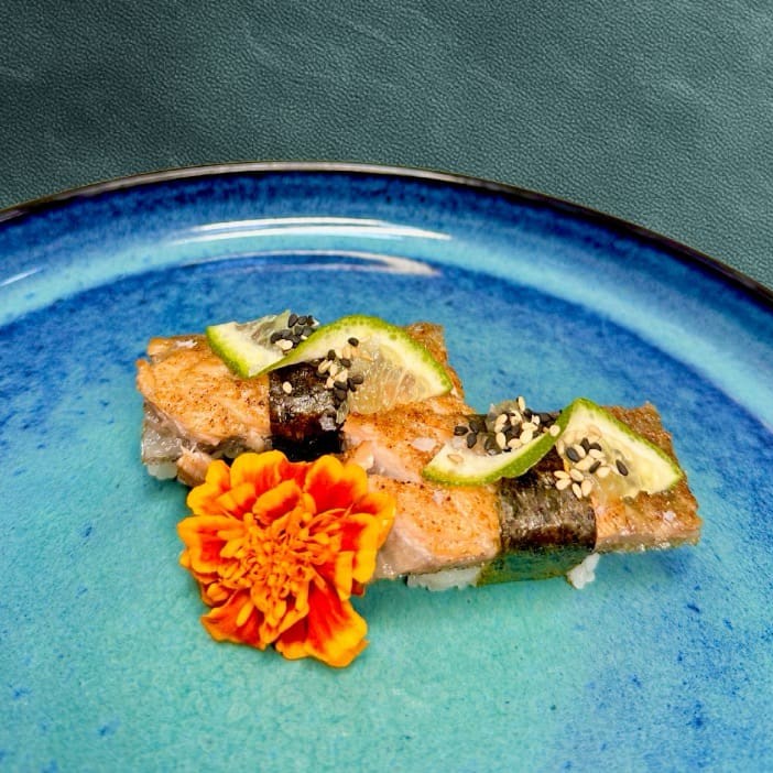 Lâmina de salmão enrolada com arroz japonês, recheada com salmão batido, maçaricado e finalizado com mel trufado, criando uma experiência gourmet única.