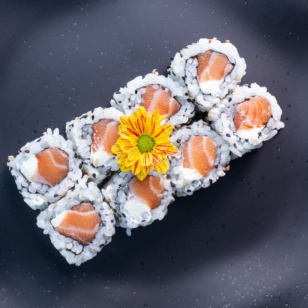 Clássico enrolado de arroz japonês e alga, recheado com salmão fresco e creamy cheese.