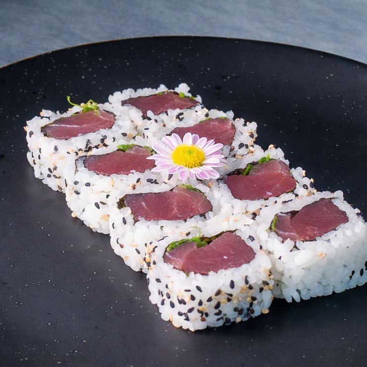 Saboreie o uramaki de atum, onde alga nori e arroz japonês se encontram com atum e gergelim, proporcionando uma experiência de sabor autêntica.