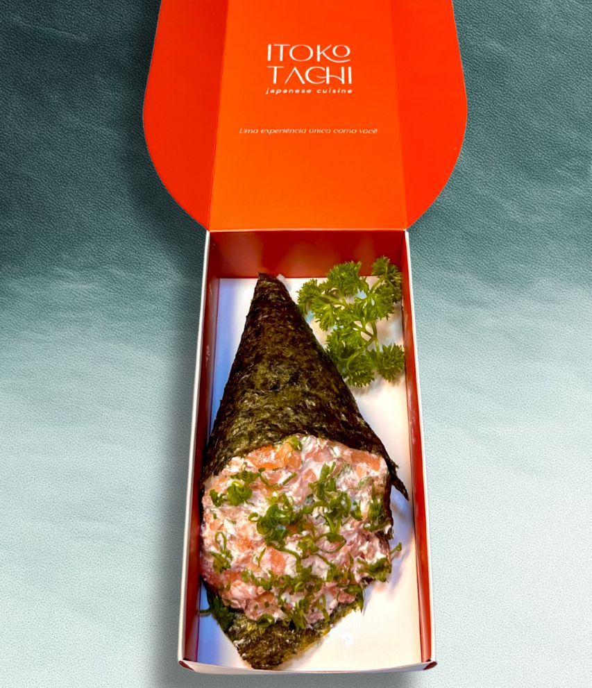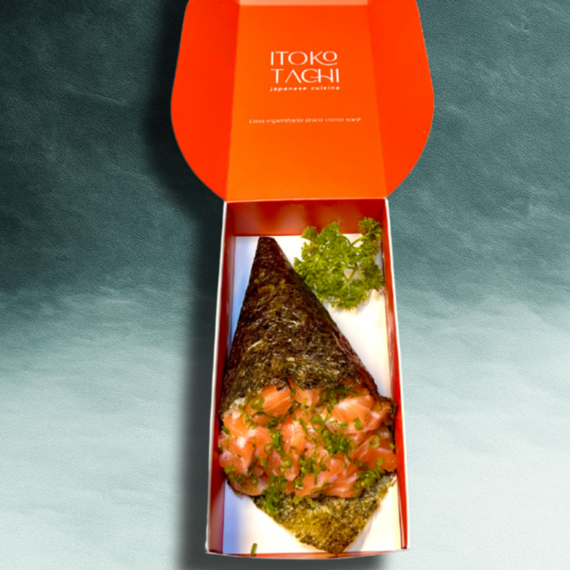 Delicada lâmina de salmão enrolada com arroz japonês, recheada com salmão batido e finalizada com cebolinha, proporcionando uma experiência tradicional e saborosa.